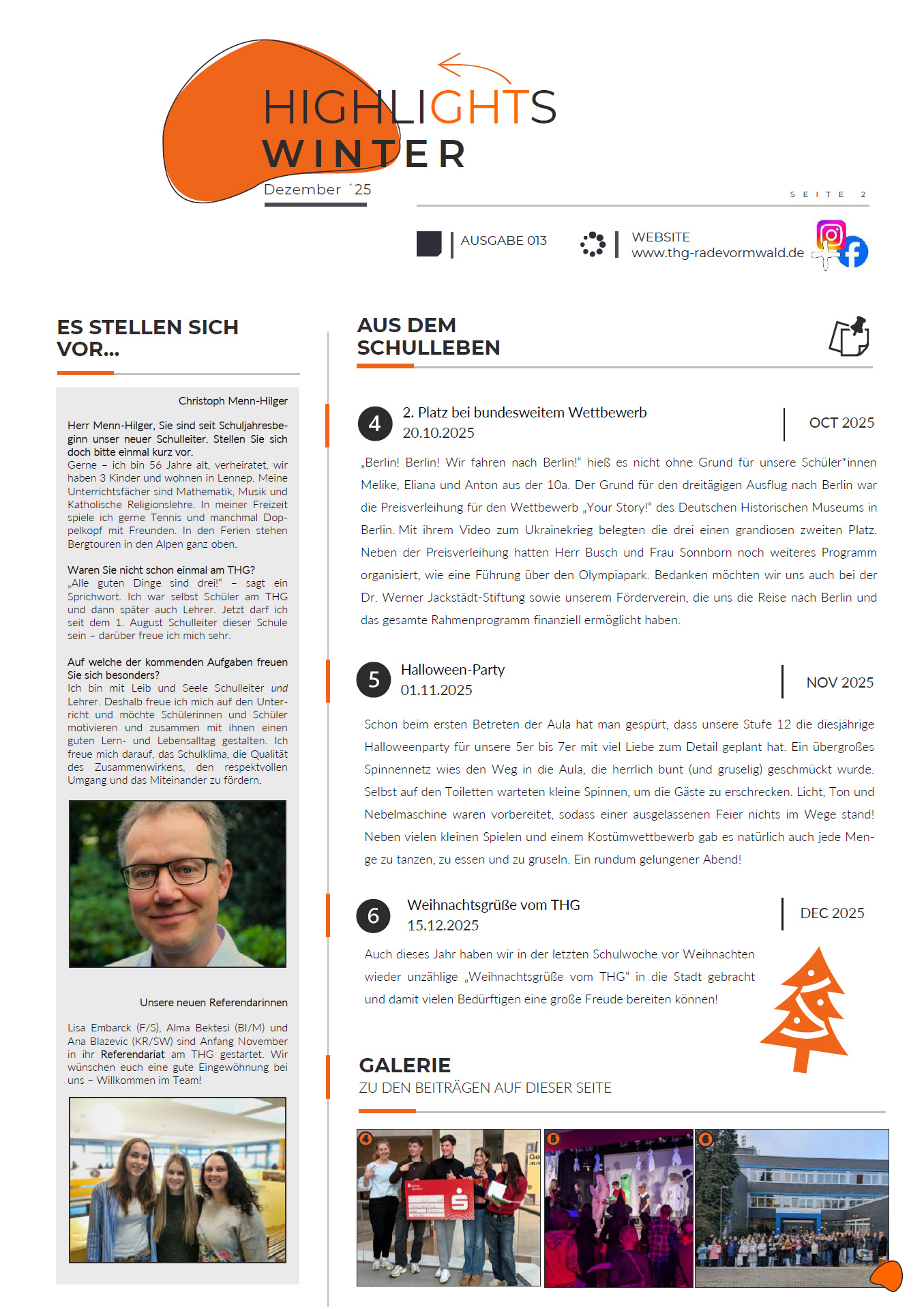 Liebe Schülerinnen und Schüler, liebe Eltern! Wir wünschen Ihnen und Euch ein frohes Weihnachtsfest und danken von Herzen für die vertrauensvolle Zusammenarbeit in diesem Jahr. Das gute Miteinander an unserer Schule macht uns zuversichtlich für 2026 – auch wenn wir wissen, dass weiterhin große Aufgaben vor uns allen liegen. Neben offenem Austausch und guten Ideen werden wir dafür vor allem viel Energie brauchen. Umso dankbarer sind wir für Ihren und Euren engagierten Einsatz im vergangenen Jahr. Mit den besten Wünschen für ein gesundes und glückliches 2026! Herzliche Grüße, Christoph Menn-Hilger und Nina Heinze