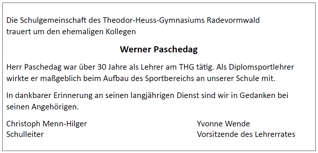 Die Schulgemeinschaft des Theodor-Heuss-Gymnasiums Radevormwald trauert um den ehemaligen Kollegen Werner Paschedag.