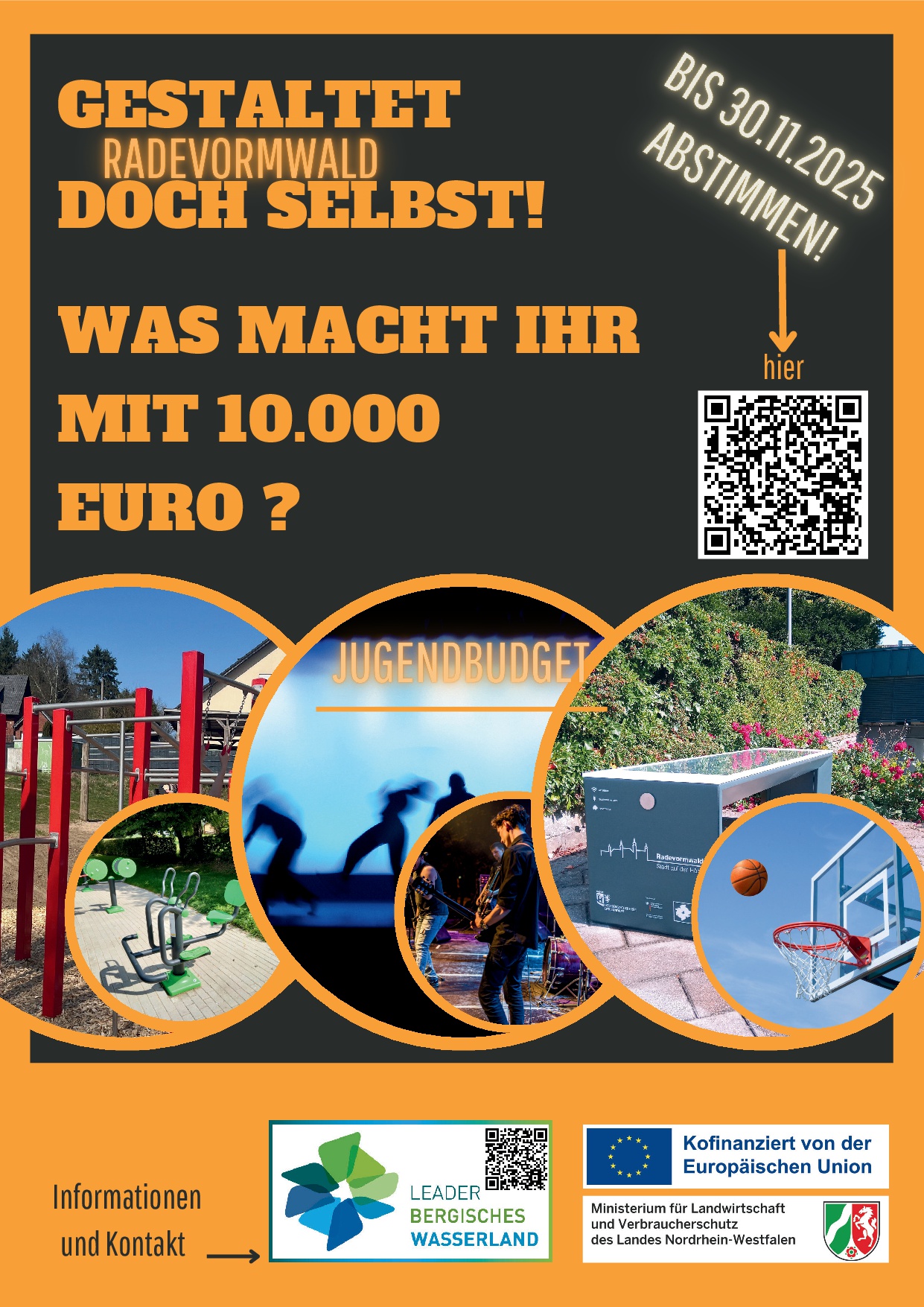 Habt ihr Ideen, was in Radevormwald mit 10.000 € umgesetzt werden könnte? Über den QR-Code könnt ihr Eure Vorschläge einbringen; also: Macht mit und gestaltet eure Heimatstadt! Die gesammelten Ideen werden dem Jugendbeirat vorgestellt, der dann über das Projekt entscheidet.