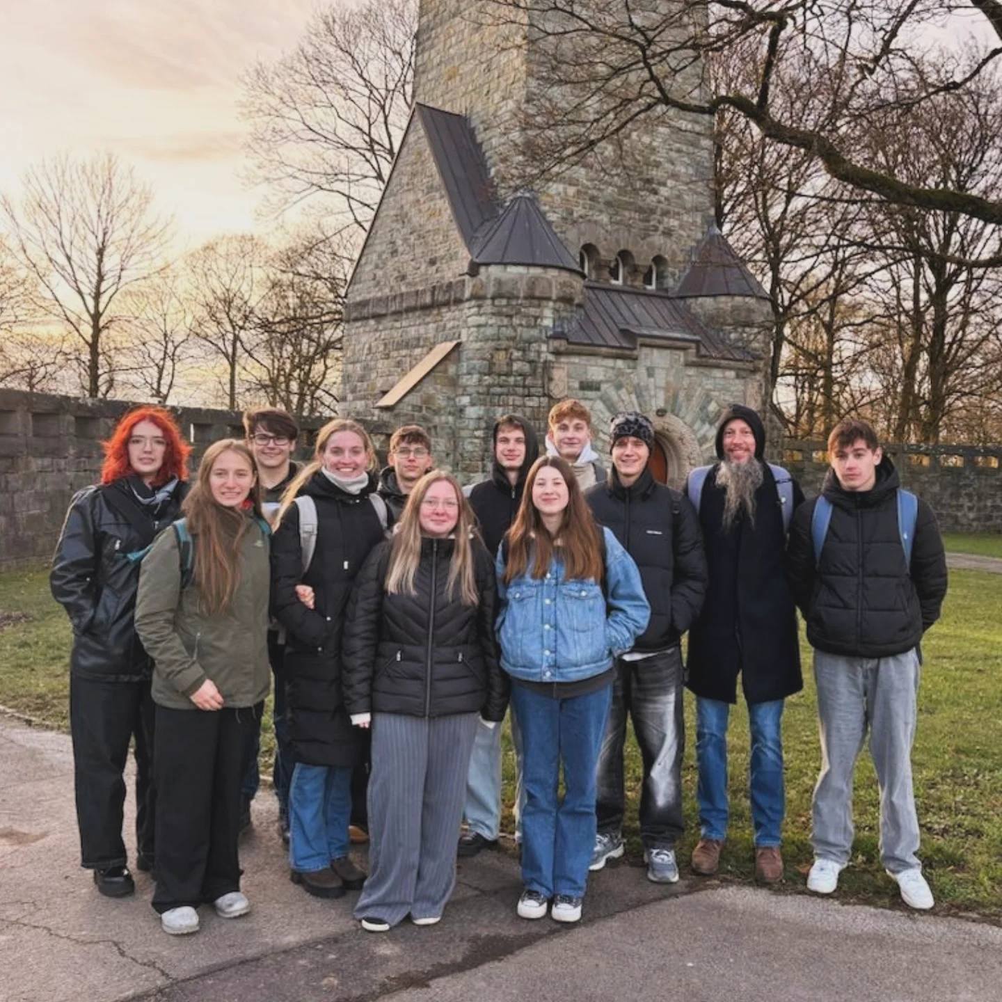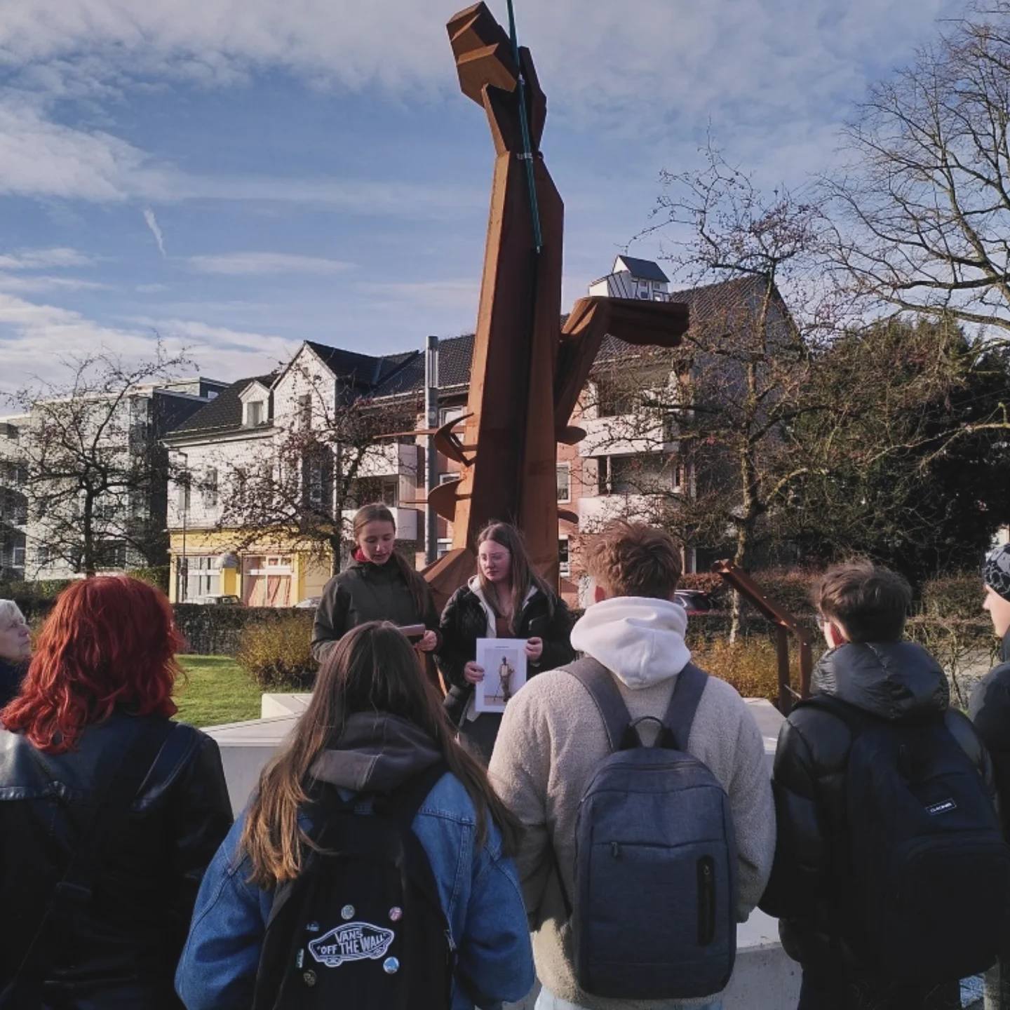 Mit dem Linienbus ging es am Montag, dem 01.12, nach Remscheid. An außerschulischen Lernorten verfolgten wir Bismarcks Spuren und sinnierten über historische Monumente und Denkmäler. Am Bismarckturm durften wir dabei einem aufschlussreichen Referat über den Bismarck-Kult lauschen. Höhepunkt waren jedoch die Stationen des neuen Holocaust-Denkmals von Gad Frank am Quimper Park, ebenfalls von einem ergiebigen Referat flankiert, und schließlich die Führung in der Gedenkstätte Pferdestall. Ein großes Danke sei an dieser Stelle den Vorsitzenden Frau Wasserfuhr und Frau Blesius von der Gedenk- u. Bildungsstätte gerichtet, die uns kompetent und emphatisch die Gräueltaten der NS-Zeit vor Augen führten und ein eindrückliches Appell für Demokratie, Humanität und die Wichtigkeit des Erinnerns vor Augen führten.